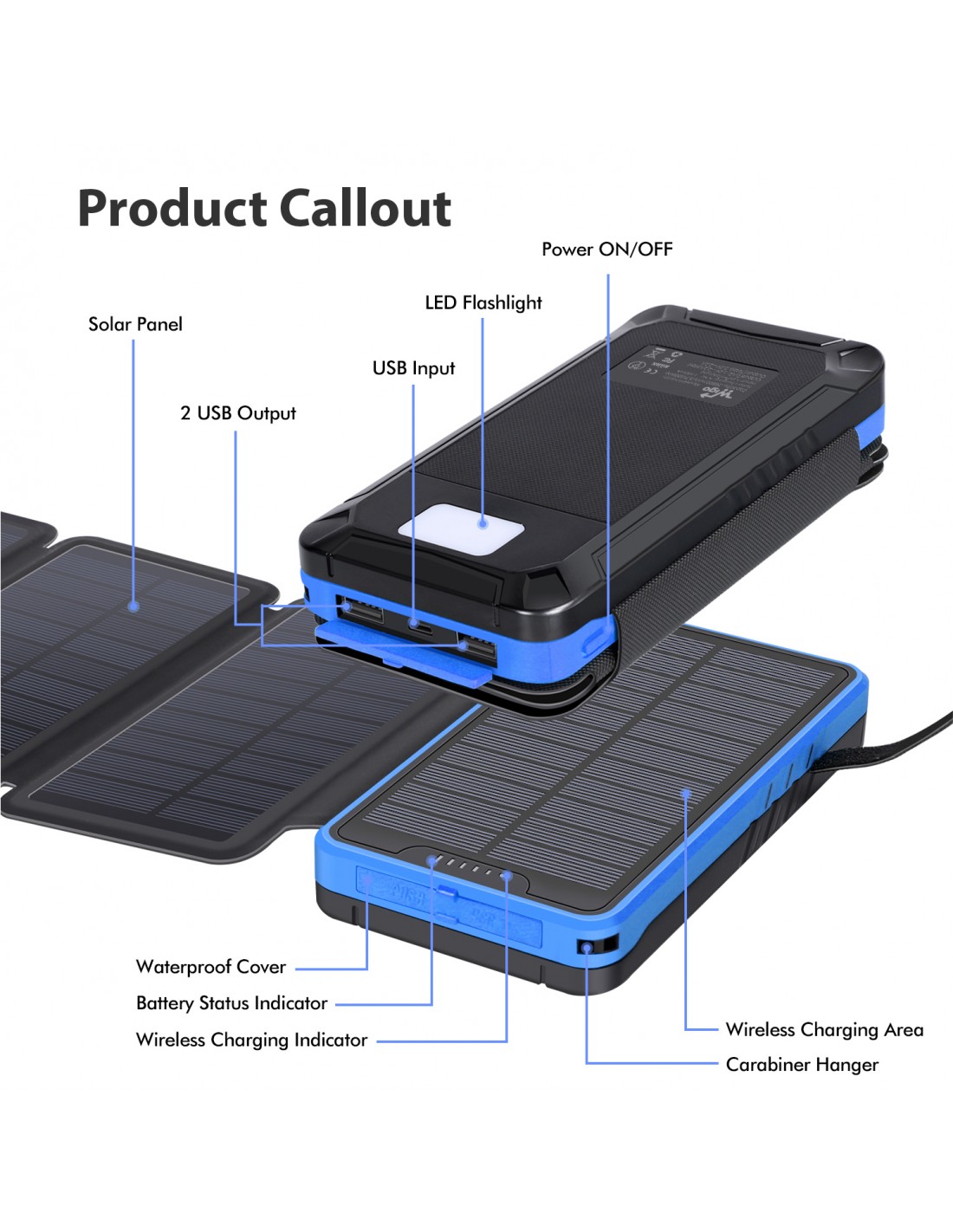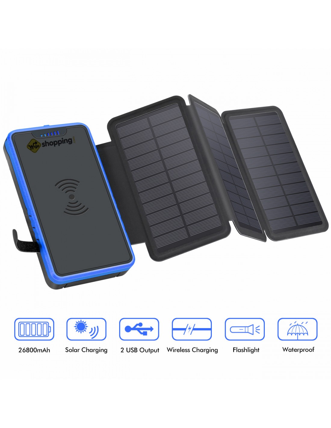 Power Bank Chargeur à Induction sans Fil Solaire 26800mAh, 3 panneaux solaires, lampe de poche, deux ports USB 5V Bleu